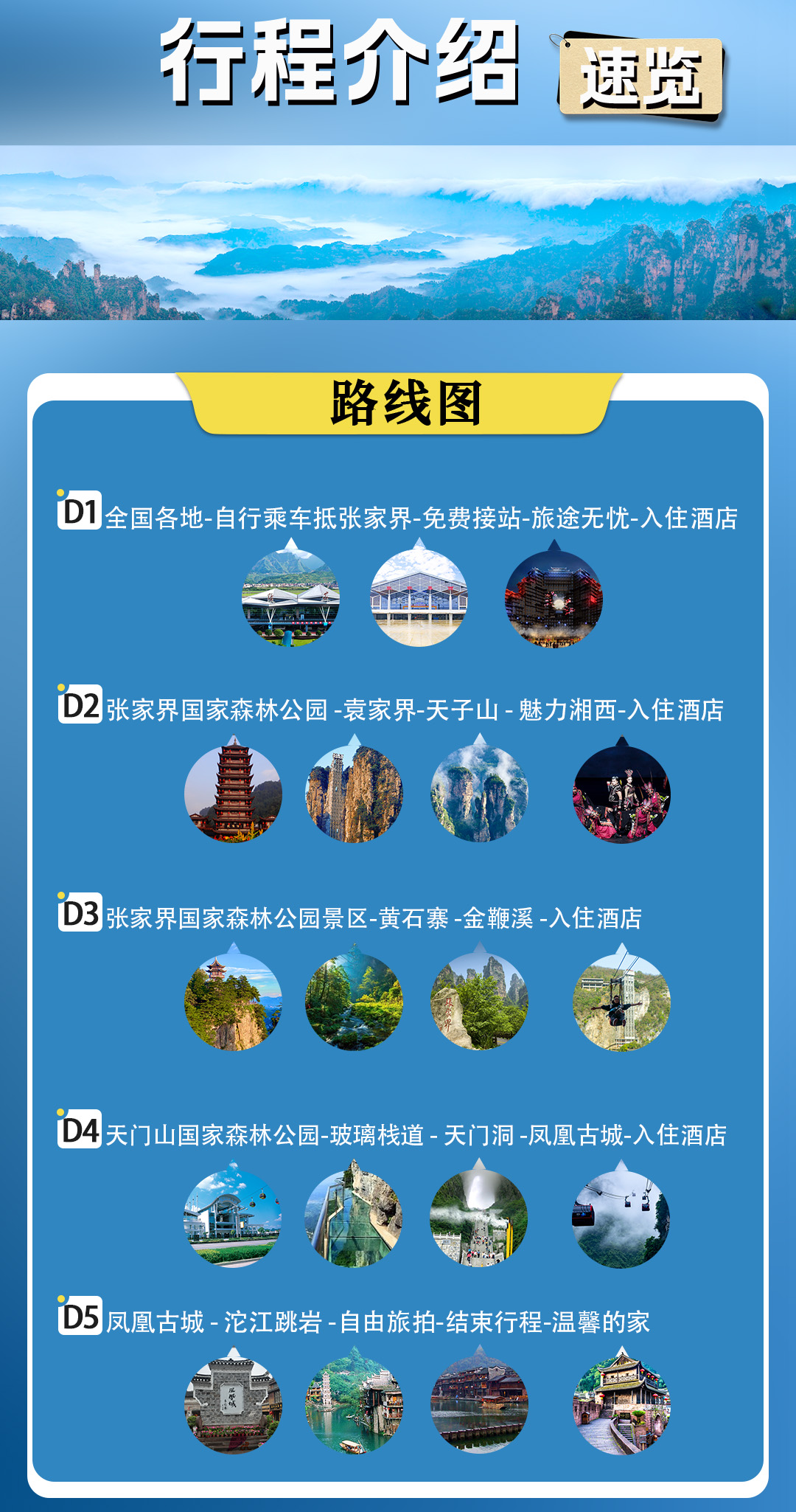 2.景区索道:百龙天梯上行+天子山索道下行+十里画廊小火车+黄石寨索道往返+凤凰古城接驳车+天门山扶梯鞋套;