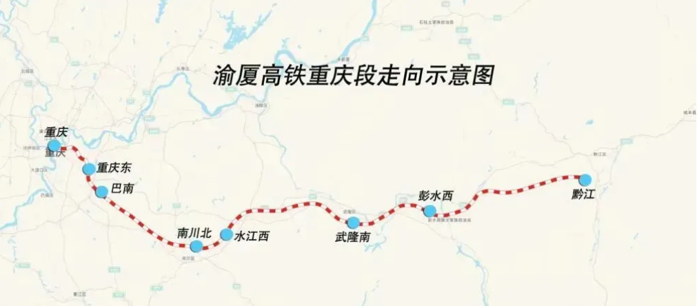 线路介绍渝厦高铁重庆段从重庆中心城区到黔江区,全长269.5公里,是国家中长期铁路网规划的“八纵八横”高铁网中渝厦通道的重要组成部分。