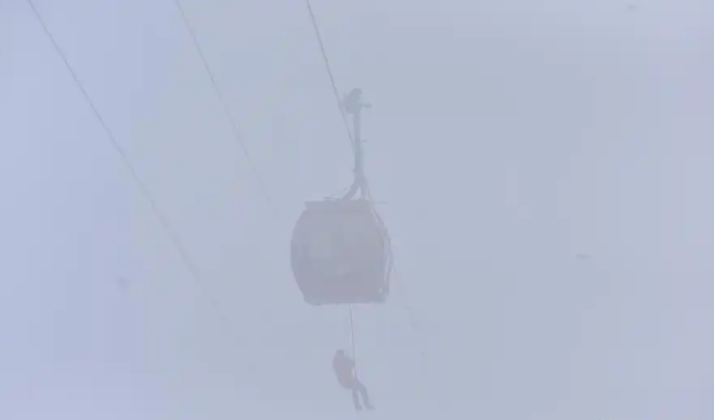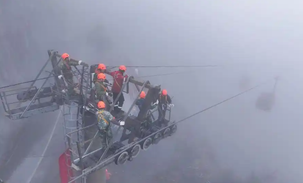 3月4日,张家界天门山索道在浓雾笼罩的环境中开展了一场紧张而有序的救援演练,模拟在悬崖绝壁间营救被困轿厢游客的情景。