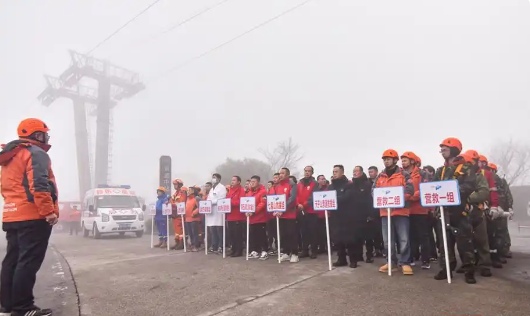 演习正式开始,运行中的天门山索道突然停止,模拟轿厢中的乘客被困。今日山顶飘雪,演习现场大雾弥漫,能见度极低,这为救援行动增添了额外的难度和紧迫感。虽然现场气温接近0°,但救援人员已经大汗淋漓。
